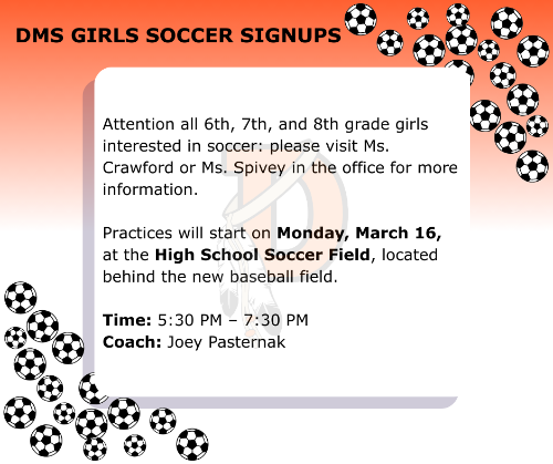 DMS offers after school tutoring sessions for any DMS student that needs/wants extra support. Each session runs from 2:30 - 3:30 PM. Transportation will not be provided for those staying. Students will need to be picked up or given permission to walk home at the end of each session. Pick-up will be in the front of the school building. |