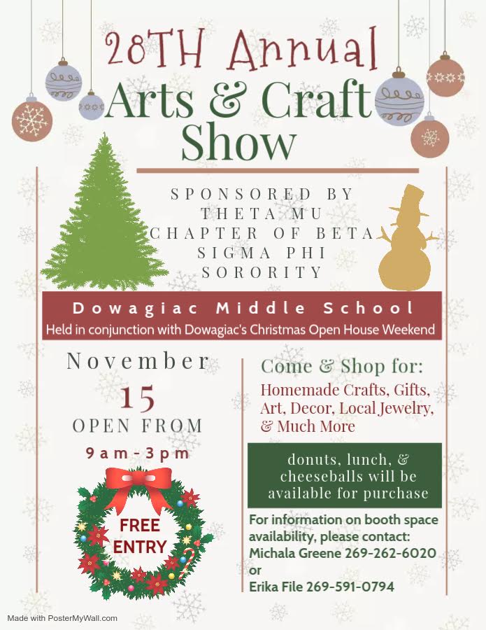 ELKS HOOP SHOOT 2025: The Dowagiac Elks Club #889 is hosting it's Annual Hoop Shoot Contest. This event is open to Boys & Girls, ages 8-13 before April 1st. Registration will start at 10:00 a.m. and the Shoot will begin at 11:00 a.m. This event will be held Saturday, December 6, 2025 at the Dowagiac High School in the New Gym. There is no cost to participate in the Hoop Shoot. Questions, contact Mike Behnke at 269-462-0952.