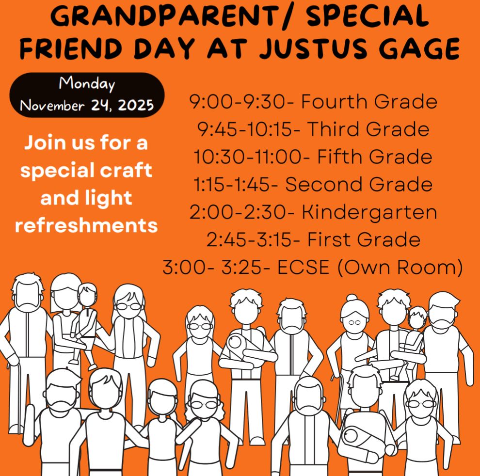 Grandparents/Special Friends Day Reminder: This special day for our students and community will be held on Monday, November 24th. Please refer to the flyer below for grade level times and general information.